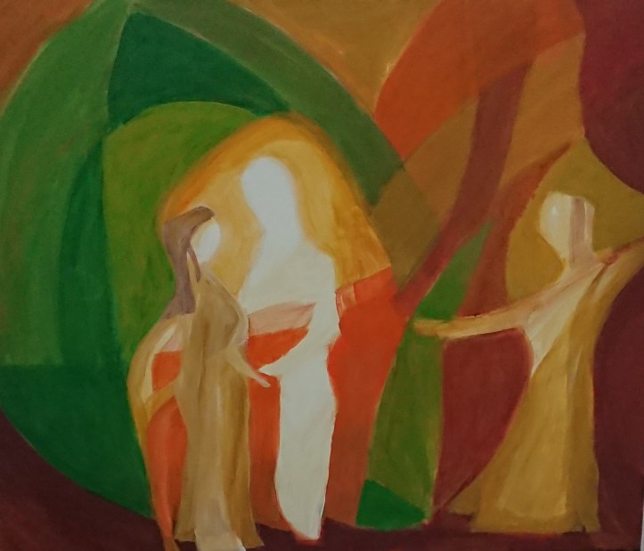 Die Idee dabei war, dass wir gerne ein Bild gehabt hätten, das wir in unserem Eingang aufhängen wollten. Der oben genannte Vers aus der Bibel kam uns dabei in den Sinn. Ich erzählte der routinierten Malerin von unseren groben Idee und würde es ihr überlassen, sich etwas zu dem Spruch einfallen zu lassen.